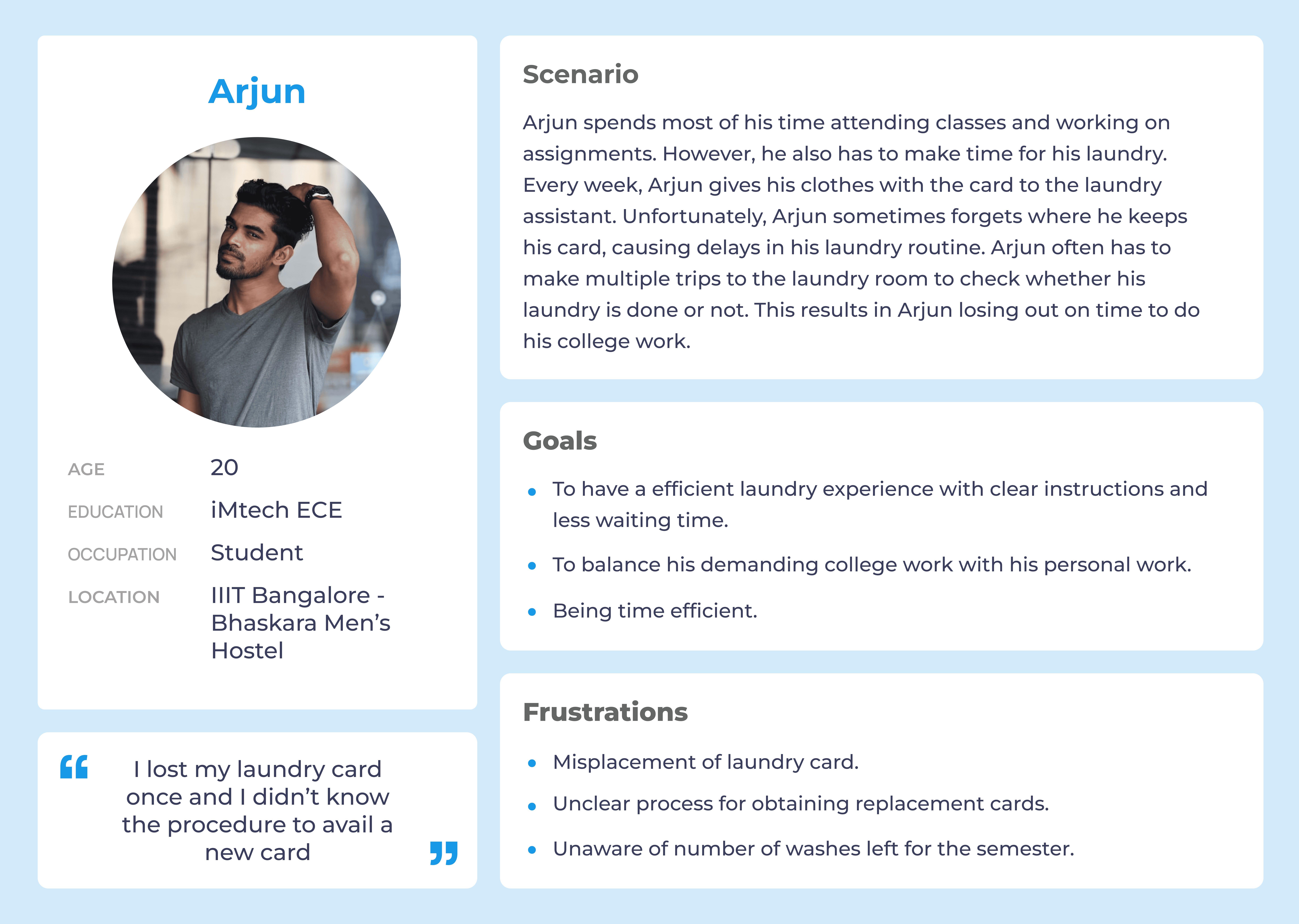 The current card-based laundry system at IIITB is causing difficulties for students, leading to common complaints such as misplacement of card, unclear processes for availing new card and long wait times.