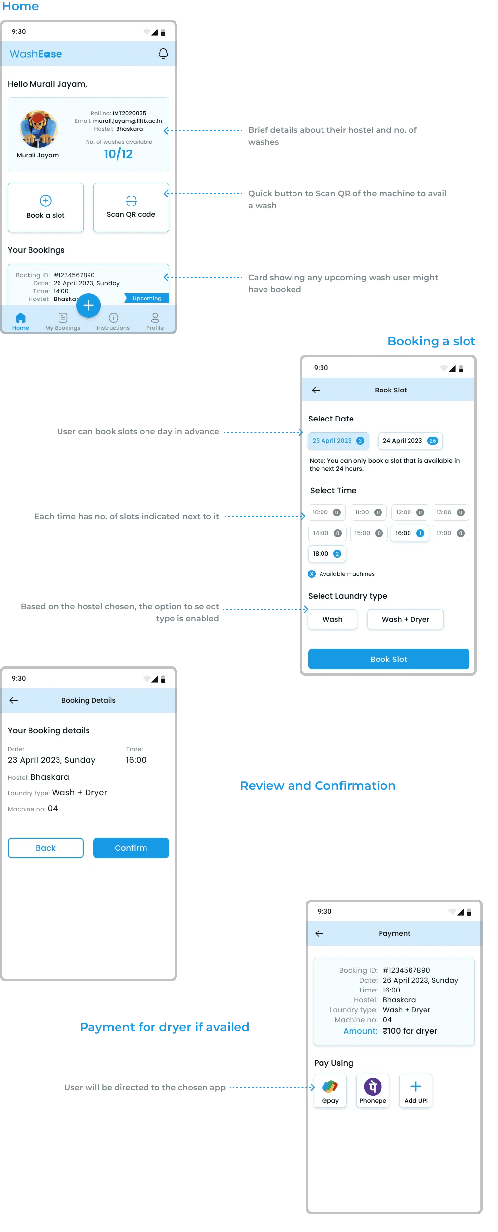 A mobile app that streamlines laundry by simplifying replacement cards, booking slots, and providing timely pickup notifications.